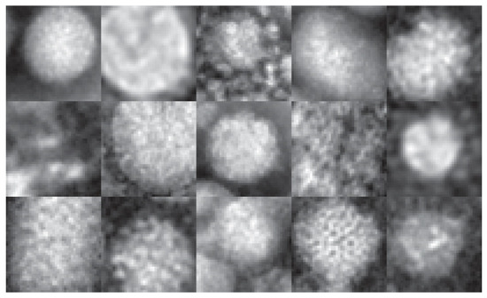 Examples of all 15 classes in the virus benchmark [40] (moving left to right, with class 1 top left and class 15 bottom right).