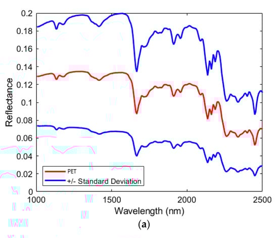 The average raw reflectance spectra and the standard deviation of the two classes of polymers are shown in Figure 3. PET average spectrum was characterized by absorption bands of C-H2 and C-H of the third harmonic region (1131 and 1182 nm), C-H of the second harmonic region (1402, 1665, 1723, 1825, 1910, and 1960 nm) and C-H stretching vibrations + C-H deformation of first combination region (2090, 2136, 2161, 2186, and 2261 nm). The average spectrum of contaminants showed a complex fingerprint due to the presence of different types of polymers, with the main absorption bands located around 1220, 1402, 1735, and 2317 nm.