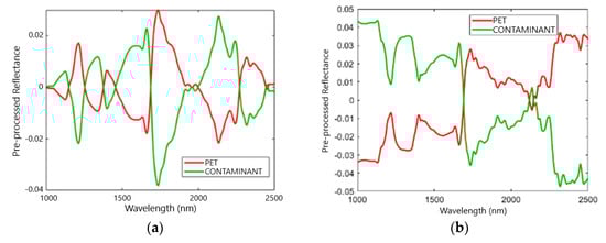 The average reflectance spectra of the PET and contaminant classes resulting from the application of the aforementioned preprocessing sets, are shown in Figure 4.