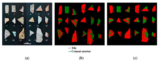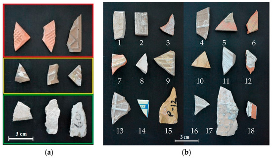 The calibration dataset was used to build the classification model and consist of three classes of materials: pure tile, partially covered tile, and pure cement mortar fragments (Figure 1a). The validation dataset consists of a mosaic of two acquisitions, containing a mixture of clean tile (1, 6, 8, 10, and 14) and tile partially (3–5, 7, 9, 11–13, 15–18) or totally covered (2) by cement mortar (Figure 1b). Micro-XRF and HSI analyses were carried out at the Raw-Materials Lab of the Department of Chemical Engineering, Materials and Environment (Sapienza—University of Rome, Italy).