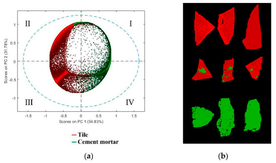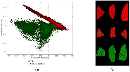 PCA model requires four PCs to express a total captured variance of 91.90%. The PC1-PC3 score plot (Figure 5a) shows good discrimination between tile and cement mortar. In particular, the analysis of PC1 and PC3 shows that cement mortar is clustered into two subgroups, due to different morphology of the selected samples, which produces scattering noise. The false color image (Figure 5b) shows fragment pixels corresponding to the two classes set on the PCA score plot.