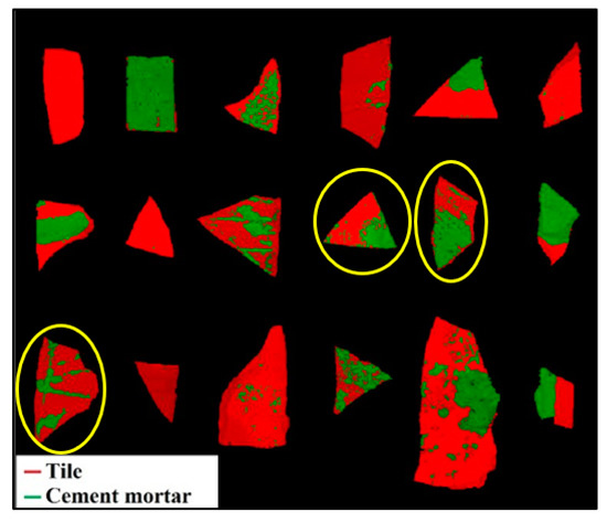 Nowadays, the main difficulty in a post-earthquake flow stream is to evaluate the quality of recovered materials characterized by similar chemical composition, but presenting different mechanical proprieties, these latter strongly influencing their correct reuse: the presence of cement mortar in recovered inert products (i.e., aggregates, tiles, bricks, etc.) can dramatically influence the possibilities of their correct reuse as recycled aggregate. Concerning RA, previous studies have demonstrated the possibility of evaluating building waste by HSI, assessing the presence of contaminants in RA, and classifying end-of-life construction materials [41,42,43,44]. However, few studies have been carried out on the monitoring of tiles coming from post-disaster building waste and on their possible reuse as RMA, despite their high presence in earthquake-damaged structures. For this reason, in this work, the evaluation of the degree of liberation of tile fragments from cement mortar was performed by HSI coupled with a machine learning approach. More specifically, the acquired hyperspectral data were first examined using principal component analysis (PCA). Then, a classification model, based on partial least squares-discriminant analysis (PLS-DA) was applied to detect cement mortar covering the tile and the relative degree of liberation. The same samples underwent preliminary investigation by micro X-ray fluorescence (micro-XRF) to obtain the chemical element maps showing the distribution of cement mortar on the surface of tile fragments. The micro-XRF maps were then compared with the corresponding maps generated by hyperspectral modelling. The improvement of this strategy, able to recognize and topologically evaluate the detected contaminants, can represent a valid and efficient method for obtaining a higher quality of recycled tiles from building waste.