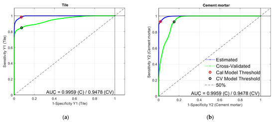 ROC curves for tile and cement mortar classes are shown in Figure 7. As expected from the results of Table 1, the ROC curves of both classes are of good quality.