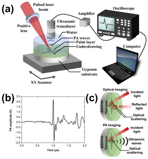 (a) Three-dimensional scheme of the reflection-mode photoacoustic (PA) imaging apparatus; (b) typical PA signal recorded in the time domain; (c) principle of optical and PA imaging for the detection of hidden underdrawings.