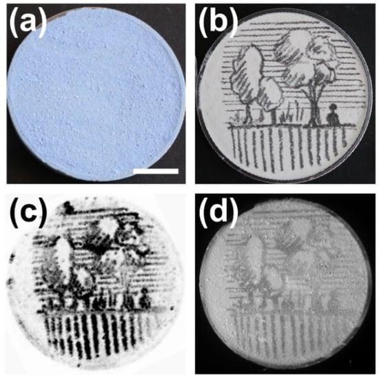 Images (a) of a mock-up covered with a paint layer containing a mixture of titanium white, gypsum, and ultramarine blue pigments, (b) of an underlying pencil sketch prior to the application of the paint; (c) maximum amplitude projection (MAP) PA reconstruction of the hidden underdrawing; (d) respective near-infrared (NIR) image recorded at 1100 nm. Scale bar corresponds to 1 cm.
