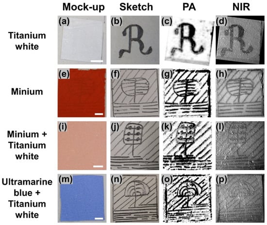 Images (a) of a mock-up covered by a titanium white paint layer, (b) of the underlying pencil sketch prior to overpainting; (c) MAP PA reconstruction of the hidden letter “R”; (d) respective NIR image recorded at 1100 nm. Analog results are presented for minium (e–h), minium plus titanium white (i–l), as well as ultramarine blue plus titanium white paint layers (m–p). All scale bars are equal to 5 mm.