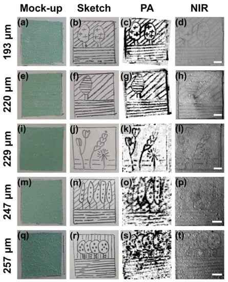 Images (a) of a mock-up covered by a mixture of chromium green and titanium white paint layer, (b) of the underlying pencil sketch prior to overpainting; (c) MAP PA reconstruction of the hidden sketch; (d) respective NIR image recorded at 1100 nm. Similar results are presented for mock-ups covered by paint layers of identical composition but with a gradually increasing average thickness, as presented on the left side of the panel (e–t). All scale bars are equal to 5 mm.