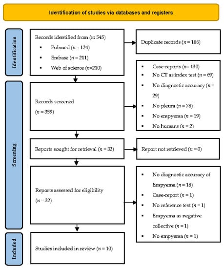 The initial search identified 545 studies, which were screened by title and abstract after deduplication. Figure 1 shows the study flow detailing search results and study inclusion. No comparable study was found on Cochrane library, Clinical Trials, or Prospero. A total of 32 articles were eligible for full-text screening and were examined in detail according to the pre-specified PICOT criteria. A manual search of references from these studies and reviews did not yield any additional records. A total of 22 were excluded (see Table A1) after full-text assessment for the following reasons: No diagnostic accuracy design [,,,,,,,,,,,,,,,,,] (n = 18), no empyema in the study collective [] (n = 1), case-report [] (n = 1), no reference test [] (n = 1), and empyema as negative collective [].