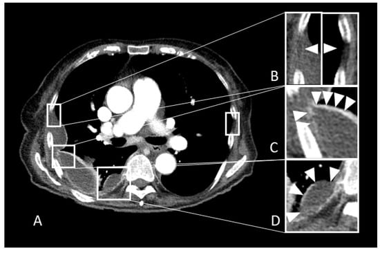 Pathological confirmed pleural empyema of an 83-year-old female patient. (A): Original axial slice with empyema on the right side. (B–D) Magnifications views with (B): Pleural fat thickening and increased attenuation (fat stranding) compared to the contralateral side. (C): Pleural thickening with an increased enhancement of the pleura. (D): Loculation (biconvex, acute marginal angles).