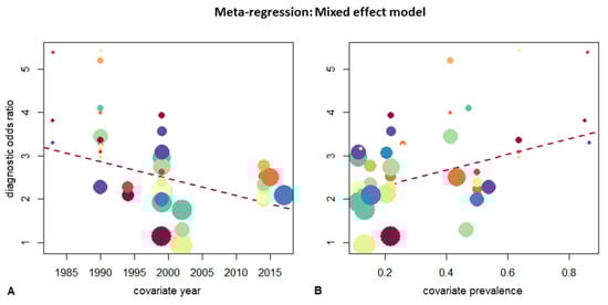 Studies after 2000 showed higher pooled specificity with 92% (95%-CI 87–95%) compared to 84% (95%CI 78–88%), with an inverse tendency in sensitivity of 59% (>2000; 95%CI 50–67%) compared to 63% (<2000, 95%CI 54–71). The mixed-effect model (p = 0.02) estimated the amount of heterogeneity to be 4.92% (R2) for the year of publication (residual heterogeneity I2: 25.8%, sampling variability H2: 1.35). Figure 3 shows the metaregression for the covariate’s year and prevalence.
