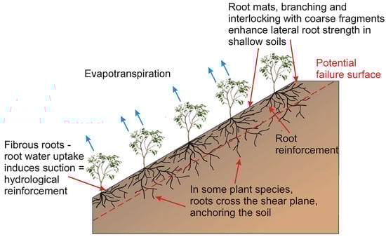 Roots are commonly employed as a bio-engineering technique for slope stability, particularly for infrastructure earthworks [1,2,3]. Plants stabilise the soil through mechanical reinforcement, as the root system causes an increase in the tensile strength of the soil [1,4]. This is most effective at shallow depths, where surface erosion and shallow slope failures occur [2] as seen in Figure 1. The root contribution to soil stability is governed by the root architecture and root mass, where shallow mat root systems are effective for erosion stability but are not suitable against shallow slope failures [5]. Stability is also provided through hydrological reinforcement, which results from evapotranspiration-induced matric suction increasing the shear strength of the soil, thus reinforcing the soil [1].