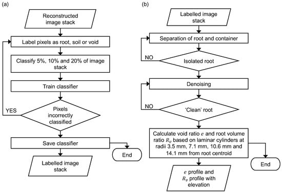 Using the reconstructed images, the three phases of root, soil and voids are defined and identified using segmentation. The algorithmic steps of this process can be seen in Figure 3a. Segmentation is undertaken, using the open source software FIJI and the plug-in Trainable Weka Segmentation 3D [26]. The three classes of root, soil and voids are manually assigned to a set of input pixels of an image substack, with the classifiers developed based on training 5%, 10% and 20% of the image stacks. Each image stack representing one scan contains 680 re-sampled 2D slices of dimensions pixels with 8-bit depth µm. Each classifier is trained and applied to all image substacks, creating labelled image stacks. The images used for training are selected to represent all three phases clearly. During supervised training, samples of each phase are identified to represent the range of intensity values corresponding to each of them. The exact operations of the machine learning algorithm used in this study are explained in [26]. The time taken to create and train a classifier is shown in Table 1. After labelling, small and isolated voxel clusters originally assigned to the root class (byproducts of segmentation) are removed during a noise elimination step, aimed at ensuring the root is identified accurately. In particular, isolated regions with fewer than 10 pixels are removed.