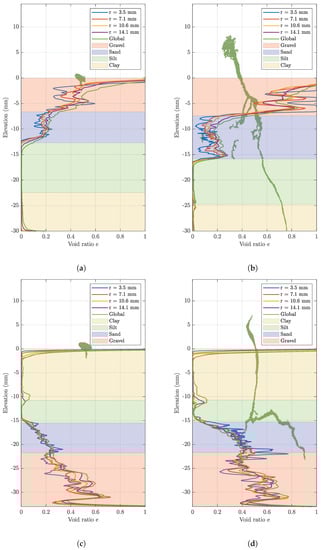 Void ratio profiles with elevation of (a) Sample A, day 1, (b) sample A, day 15, (c) sample B, day 1, and (d) sample B, day 15, using the 10% classifier (the layer thickness corresponds to averaged elevation for each stratum).