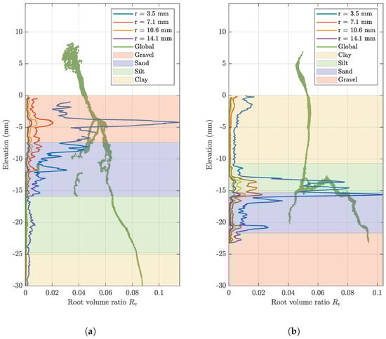 Root volume ratio profiles with elevation of (a) sample A, day 15 and (b) sample B, day 15, using the 10% classifier (the layer thickness corresponds to averaged elevation for each stratum).
