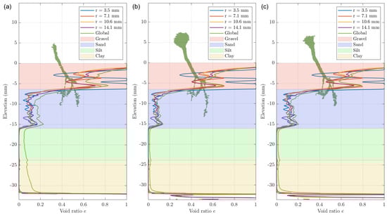 Despite this, increases in the global void ratio at the clay–silt interface are evident in sample B (Figure 6). This can be attributed to cracking at this interface that is particularly evident at the container boundaries. Micro-crack formation can occur, as water uptake can cause localised variations in the water content, resulting in soil shrinkage [13]. When the root encounters the sand layer, an increase in the void ratio is induced. There is also a visible trend of a rising void ratio moving from the bulk soil into the rhizosphere, as seen in Figure 6. The change in soil fabric is proposed to have contributed to this increase, as the root moves from the silt layer to the sand layer where larger voids are present. This allows the root to displace sand grains for elongation, thereby inducing a higher void ratio in the root’s immediate vicinity. Although the root tip is visible in the top gravel layer by day 15, there is an increase in the void ratio where the root is present. This is observed for the ROI of 3.5 mm, where grain displacement likely occurs.