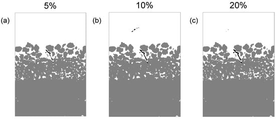 As the classifiers are trained to act at different training percentages, the outcomes illustrate the discrepancies in the accuracy of the segmentation. The results from each classifier display similar trends in void ratio and root volume ratio; however, the degree of change in the values varies. As expected, the 10% and 20% classifiers generate image labelling of higher quality in comparison to the 5% classifier (Figure 8). As seen in Figure 8b,c, the void ratio outcomes using the 10% and 20% classifier are similar. However, there are observable differences between these results, as the 10% classifier produces a lower void ratio in comparison to the 20% classifier. In Figure 8, there is also a marked difference in the volume of root identified across the different classifiers, as the 5% and 20% classifiers demonstrate that features of the root are lost. This suggests that the 10% classifier is able to obtain more accurate segmentation, as over-segmentation in the 20% classifier results in the root voxels being broken into smaller groups, whereas the 5% classifier produces poor results due to under-segmentation (Figure 9). This analysis suggests that in most cases, the 10% classifier obtains enhanced results, with marked differences in segmentation depending on the extent of training undertaken. The values of the void ratio and root volume ratio are provided as supplementary material for all samples, days of scanning and training data set sizes.