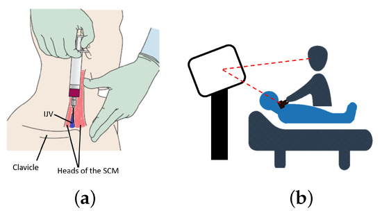 The US images used for needle guidance can be captured with the US probe oriented transversely to the vein, showing the short axis (SAX) image such that the needle is inserted “out-of-plane”, or parallel to the vein [14,17]. Alternatively, the long axis (LAX) can be captured such that the needle is inserted “in-plane”, or at an oblique orientation relative to the US image [14,17]. While there are no data to suggest which approach is superior [8], SAX with the out-of-plane approach is the preferred option [16] because it is easier to learn [18] and results in higher success rates with the first attempt for CVC placement in the IJV [19]. However, in this approach, the needle tip and shaft both appear as hyperechoic spots in the US image, making it challenging to distinguish one from the other. The uncertainty surrounding the exact location of the needle tip in US images is associated with inadvertent arterial, posterior IJV, and pleural punctures [11,20,21]. As a result, acute adverse events still occur under US-guided CVC, with an adverse event rate as high as 19.7% being reported in the literature [22] (or a complication rate of 4.6% as reported by [23]). The key challenge for US-guided CVC is maintaining visibility of the needle tip in the US image throughout the entire insertion [8]. The success of vein puncture may be affected by the inability to visualize all relevant anatomy and the needle tip within the limited 2D US field of view (FoV). Additionally, the clinician obtains the visual information to guide the insertion from the US console while simultaneously performing the insertion on the patient. This results in a decoupling of their visual and motor fields, which may affect insertion success.