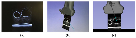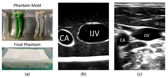 A US-compatible phantom for simulated CVC insertion was created, consisting of two hollow vasculature structures representative of the CA and IJV. The CA and IJV were segmented in 3D from a CT scan of a subject’s neck, with the resulting volumes used to manufacture molds using a 3D printer. These molds were then embedded as cores with polyvinyl alcohol cryogel (PVAc). The vessels were positioned such that the IJV was cm from the surface of the phantom, which is representative of a normal case. After two freeze-thaw cycles, the core was removed from polymerized PVAc, creating hollow and wall-less vascular structures that mimic the appearance of the CA and IJV under US imaging (Figure 2). Polymerized PVAc after two freeze-thaw cycles exhibits speed-of-sound (SoS) of 1540 m s−1 and a tactile sensation similar to that of human tissue [28,29]. The mechanical properties of PVAc after two freeze-thaw cycles closely match that of a vessel wall [30]. Additionally, clinicians from a wide range of disciplines, including anesthesiology, cardiology, and neurology, as well as the participants in this study, have commented that interaction with PVAc models feels natural and replicates the tactile sensation of human tissue. While we have not measured the insertion forces explicitly, the study participants commented that the resistance to insertion and force required to insert the needle closely mimic the in vivo situation. To simulate pose tracking of the patient anatomy, we placed this phantom in a plastic container that contained 8 hemispherical fiducials markers and a 6 Degree-of-Freedom (DoF) magnetic pose sensor. A cone-beam CT scan of this phantom was taken (O-arm, Medtronic, Minneapolis, MN, USA), from which the simulated vasculature and hemispherical fiducials were segmented, serving as ground truth. The segmented locations of these hemispherical fiducials were used to register the CT volume, and hence the segmented vasculature, with the MTS using a least-squares solution [31,32]. This phantom serves as a surrogate for patient anatomy, producing US images where the CA and IJV can be easily interpreted by the user (Figure 2).