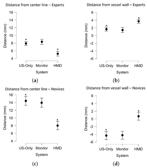 (a) Distance metrics presented with respect to system where (a,c) summarize the distances from the final needle tip position to the closest point on the center line of the vessel for experts and novices, respectively, and (b,d) summarize the distances from the final needle tip position to the closest point on the vessel wall for experts and novices, respectively. Metrics with significant differences between systems (p < 0.05) are denoted with *.
