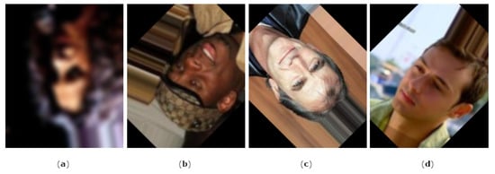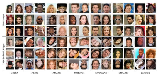Two datasets of real face images were used for the employed experimental phase: CelebA [] and FFHQ (https://github.com/NVlabs/ffhq-dataset, accessed on 3 November 2021). Different Deepfake images were generated considering StarGAN [], GDWCT [], AttGAN [], StyleGAN [] and StyleGAN2 [] architectures. In particular, CelebA images were manipulated using pre-trained models on StarGAN (https://github.com/yunjey/stargan, accessed on 3 November 2021), GDWCT (https://github.com/WonwoongCho/GDWCT, accessed on 3 November 2021) and AttGAN (https://github.com/elvisyjlin/AttGAN-PyTorch, accessed on 3 November 2021). Images of StyleGAN (https://github.com/NVlabs/stylegan, accessed on 3 November 2021) and StyleGAN2 (https://github.com/NVlabs/stylegan2, accessed on 3 November 2021) were created starting from FFHQ dataset. A detailed description of the obtained images is given below: