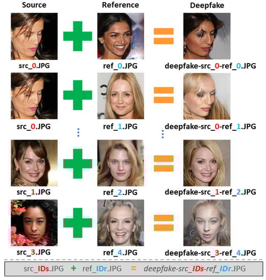 The dataset was organized into 3 different ZIP files: SOURCES.ZIP, REFERENCES.ZIP and DEEPFAKE.ZIP. Each Deepfake sample on Deepfake.ZIP was named as Deepfake-src_IDs-ref_IDr.JPG, where IDs refers to the ID of the source image on SOURCES.ZIP (with filename src_IDs.JPG) and, IDr refers to the ID of the reference image on REFERENCES.ZIP (with filename ref_IDr.JPG). Figure 5 shows some examples of images generated by StarGAN-v2.
