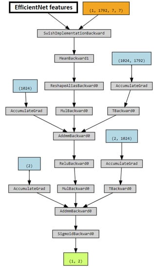 The training was done using Pytorch (pytorch.org, accessed on 1 March 2022) and Pytorch Lightning (pytorchlightning.ai, accessed on 1 March 2022) frameworks with two RTX 2080 Ti GPUs. Participants used the Adam optimizer, with an initial learning rate of . The learning rate was reduced by a factor of 0.1 if the validation loss did not decrease after five epochs. The last layer’s activation function is Sigmoid, while the loss function is Binary Cross-Entropy, which is defined as: