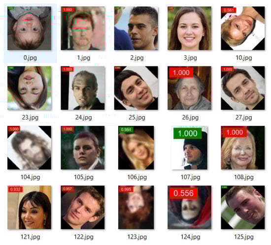 Table 1 clearly shows that the best results are achieved using model EfficientNet-B5, and for input images of size 128 × 128 pixels. This is not surprising, considering that EfficientNet-B5 is a richer model, and that larger images contain more data to guide the classification. The chosen model is therefore based on the EfficientNet-B5 model, with input size 128 × 128 and the initial learning rate is . The AUC achieved with this configuration on our tests is 0.9674. Figure 8 shows results for some test images obtained with the chosen model.