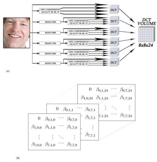 The latest generation of Deepfakes, especially those generated via GANs, are particularly insidious and affect the reliability of modern multimedia communications []. In Deepfakes where imperfections are not visible to the human eye, the image could present non-visible distortions, for example in the frequency domain []. In particular, GANs leave a specific “fingerprint”, characterized both by the network architecture (number and type of layers) and its specific parameters []. Recently, a number of techniques using the frequency domain have been proposed for the identification of these specific anomalous fingerprints, achieving competitive results [,]. Among them are Deepfake detectors based on the concept of Discrete Cosine Transform (DCT): by applying the DCT to the image [] or utilizing functions extracted from DCT blocks comparable to JPEG compression [], it is possible to characterize the unique fingerprint of the Deepfake generative architectures. However, realistic scenarios often include some additional transformations applied to the input image. For example, social networks usually resize and compress uploaded pictures to satisfy file size constraints []. State-of-the-art models have not been explicitly designed to detect Deepfakes in the presence of additional compression, rescaling and transformations and this can result in a drop in performance if the detectors are used in these conditions. To solve this issue, the PRA Lab - Div. Biometrics group proposed a Deepfake detector based on the DCT at different levels of scaling and compression.