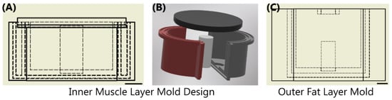Overview of Sequential Mold Setup. (A,B) The inner muscle mold was comprised of 4 components shown as a (A) cross-sectional view with inner dimensions shown as dashed lines and (B) in exploded view. Two shells were snapped together with an inner bone; top lid was assembled after the phantom solution was added. (C) The outer fat layer mold shown with the same bone in the middle of the drawing. Scale bars denote 20 mm.