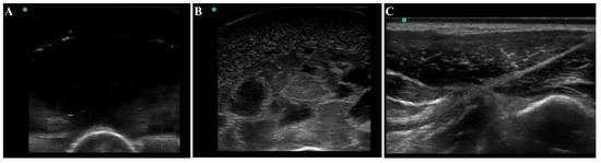 Ultrasound view of the tissue phantom compared to swine tissue. Representative ultrasound images for (A) plain gelatin phantom with no additional components, (B) the developed tissue phantom with evaporated milk, flour, and agarose fragments, and (C) swine tissue.