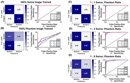 Swine-Phantom Hybrid Training Results with MobileNetv2 for Shrapnel Image Classification. Confusion matrices and ROC analyses for swine image prediction after training with image sets augmented with (A) 1:0, (B) 0:1, (C) 1:1, (D) 1:3, or (E) 1:9 swine: phantom ratios. The diagonal black dashed line in the ROC plots represents the result for random chance (AUC = 0.50) for reference.