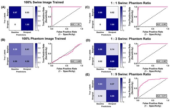 Swine-Phantom Hybrid Training Results with ShrapML for Shrapnel Image Classification. Confusion matrices and ROC analyses for swine image prediction after training with image sets augmented with (A) 1:0, (B) 0:1, (C) 1:1, (D) 1:3, or (E) 1:9 swine: phantom ratios. The diagonal black dashed line in the ROC plots represents the result for random chance (AUC = 0.50) for reference.