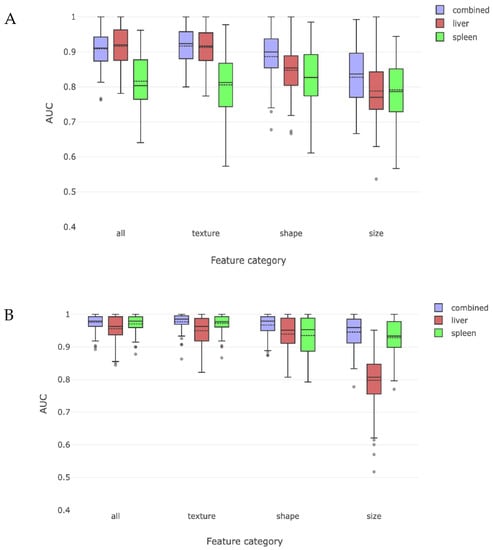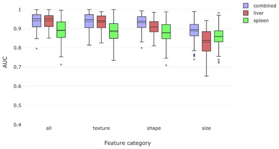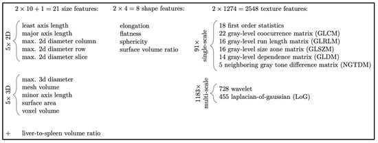 Feature analysis was performed on the contrast-enhanced imaging acquisition []. Due to the homogenous imaging conditions described above, we did not apply any kind of pre-processing such as re-sampling or other normalization. Liver and spleen images were segmented using a U-net-based network architecture successively trained on expert segmentations [,]. The PyRadiomics library (version 2.0.1) [] was used to extract 1288 features each from the liver and spleen, resulting in a total of 2577 imaging features (including a size ratio). These features were classified as size (two-dimensional, three-dimensional, liver to spleen volume ratio), shape (elongation, flatness, sphericity, surface-to-volume ratio), and texture (first order statistics, features derived from various texture descriptor matrices, as well as numerous multi-scale features based on wavelets and Laplacian-of-Gaussian analysis). Note that our feature categories (which are illustrated in Figure 1 with more detailed numbers) explicitly separate size-based features from shape features, although these are often grouped into one category []. This is motivated by the fact that liver and spleen sizes are already considered and (at least roughly) reported by radiologists, and shape (such as “nodularity”) is considered a distinct feature by physicians. Hence, we are interested in which of these individual aspects can be covered by our automatic analysis as well.