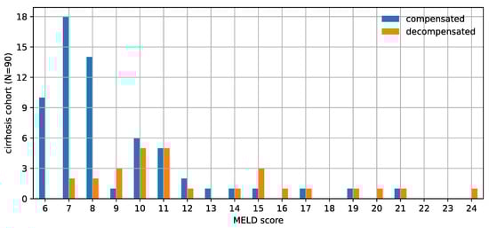 This histogram shows the distribution of the Model for End-Stage Liver Disease (MELD) score and decompensation status of the cirrhosis cohort. This cohort population is biased towards relatively milder liver disease. The imperfect correlation between MELD score and decompensation status is also evident from this chart.