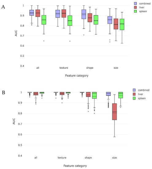 Radiomic features from liver and spleen were divided into high level classes (size, shape, and texture) to better explain their relative importance in each experiment. Note that in other literature, radiomics features of size and shape are typically combined into a single class. Distinct size and shape classes better correspond to human observations such as gross organ size and texture features such as surface nodularity, respectively.