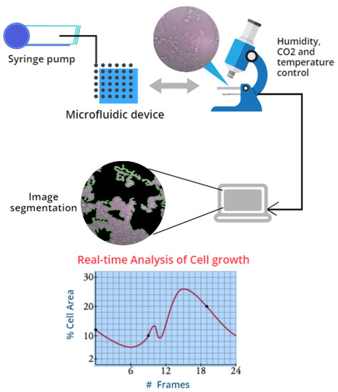 According to these characteristics, the designed system and biological framework allowed for maintaining the cells in the long term. Therefore, it is necessary to automate some of the processes that are involved in the experiment. In general, a microscope catches an image in an interval of time. This generates an image sequence that is analyzed by computational algorithms to evaluate the state of the cell culture at a specific time.