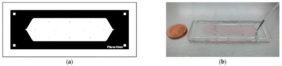 After curing, the epoxy resin mold (ERmold) was separated from the Fmold to form the male mold. Subsequently, a mixture of PDMS and curing agent in a 10:1 weight ratio (Sylgard 184 silicone elastomer kit, Dow Corning, Midland, MI, USA) was poured onto the ER mold and cured in an oven at 40 °C overnight [15]. In Figure 2, the final design and microfluid device PDMS used in the experiments are presented.