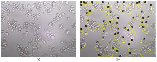 The MCF7 breast cancer cell line. (a) Image from Dataset 2—CPT_24H_72H; (b) manual segmentation of cell regions.