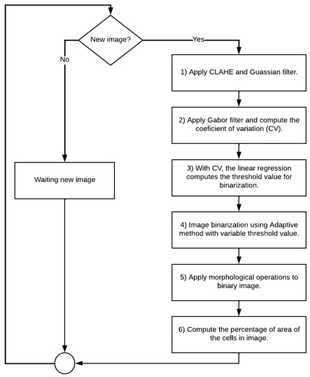 The GEMA flowchart is presented in Figure 4 where the main processes are: (a) Gabor filtering to identify regions with the highest response. (b) Compute the coefficient of variation (CV) of pixels values in an image. This coefficient will be modeled through a linear regression. (c) Binary conversion using an Adaptive method with a variable parameter, and (d) Morphological operations are applied over the binary image to connect interest regions and/or delete non-interest regions.