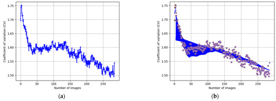 In Figure 6b, the data set with where is the length of Dataset is presented. These points represent the position in a space where is the number of frame and is its CV value. To model this coefficient, a linear regression [41] is used which is based on Equation (4):