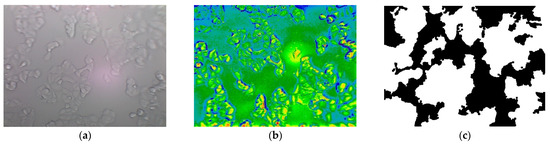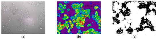 The segmentation of cells using the GEMA approach. (a) Grayscale image from Dataset_1_CONFL in apoptosis stage; (b) image applied the Gabor filter set; (c) binarization using a closing and dilate morphological operations.