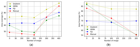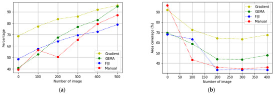 In Figure 10b, the segmentation obtained for FIJI is better than other methods. This occurs because FIJI is a semi-automatic method that includes manually setting different values to threshold parameters during the analysis of each image of the dataset according to the contrast and pixel distribution in each image. However, the accuracy evaluated in Table 1 shows that the difference between GEMA and FIJI is very low. Furthermore, in the global analysis of the results, GEMA proves to be the best algorithm for image segmentation.