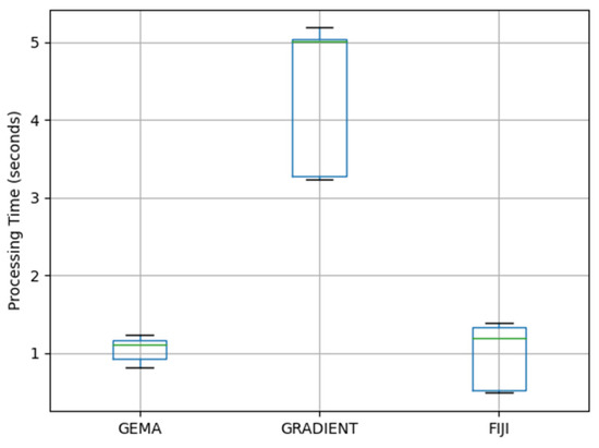 In Figure 12, the box plots show the distribution of the processing time results which are used to compare and evaluate the performance of GEMA in front of the Gradient and FIJI methods.