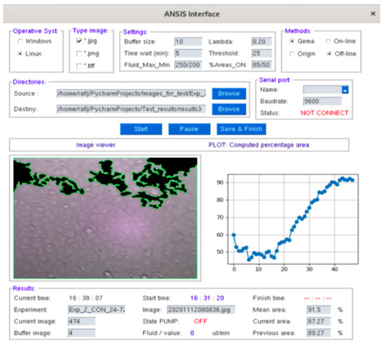In Figure 13, the ANSIS GUI is presented, which allows us to use the GEMA algorithm to detect the percentage of area occupied by MCF7 cell in real-time. Moreover, a syringe pump (Figure 1) can be controlled to inject different fluid values into a microfluid device according to increment or decrement in area of cells during the biological experiments.