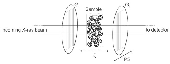 This interferometer consists of three gratings: a source grating (G0), a phase grating (G1), and an analyzer absorption grating (G2). G0 is an optional grating used to create spatial coherence of the X-ray beam when large (i.e., millimeter-sized) X-ray focal spots are used. The phase grating (G1) generates an interference pattern at discrete distances from G1 (i.e., Talbot distances), which is sampled by G2. G2 has absorbing lines and the same orientation as G1, and is placed right in front of the detector (Figure 2). Different setup geometries exist: the sample can either be placed in front (upstream) of G1 and G2 or between G1 and G2; however, the principle is the same [10].