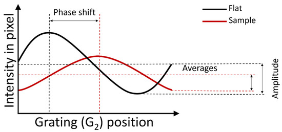 As G2 moves parallel to G1, and perpendicular to the orientation of the grating lines and the beam direction, an intensity oscillation in the detector pixels is generated. This movement of G2 is called phase stepping (PS). The resulting oscillation, which is expressed as intensity amplitude over distance moved by G2, is called the phase stepping curve (Figure 3) [6,7,11,12,13]. When phase stepping is performed both with and without a sample in place, the average intensity, amplitude, and phase of this oscillating function will be different. These changes may be quantified after extracting absorption images (average intensity), differential phase contrast images (phase shift), and dark-field images (intensity amplitude), respectively.