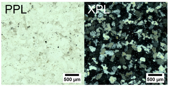 Thin section photographs of the Bray sandstone under plane- and cross-polarized light (PPL and XPL, respectively). The stone consists entirely of quartz grains. The difference in their lattice orientation results in different shades of gray under cross-polarized light. Adapted from Flepostore—https://flepostore.ugent.be/rock/be-22-0017, accessed on 9 October 2022.
