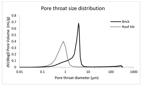 In Figure 6, the pore throat size distribution of both the fired clay brick and the roof tile samples is given. Sample TB has a mode pore throat diameter of around 4 µm, with pore throats ranging down to as small as 0.1 µm. For roof tile (TL), the mode of the pore throat diameter lies around 0.8 µm and almost no pore throats are measured with a diameter exceeding 2 µm.