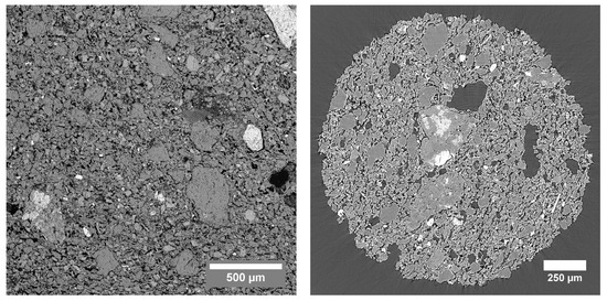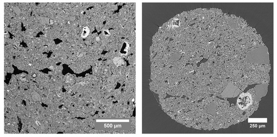 In Figure 7, a back-scattered electron image of a thin section of the TB sample is shown together with a µCT image. Gray value segmentation based on simple thresholding of the pores in the SEM image resulted in a total porosity of 25.34%. In the three-dimensional µCT dataset, the same approach of gray value segmentation resulted in a measured total porosity of 32.00%. The difference in these two values could be attributed to the fact that these measurements were not on the same sample, and on a volume that is too small to be representative for the whole material [50].