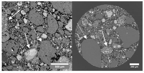 (Left): Thin section SEM image of the carbonated sample, acquired using back-scattered electrons, at a working distance of 15.18 mm. (Right): Cross section through the µCT volume, acquired at TOMCAT. The solid and dashed arrows indicate carbonated matter and quartz grains, respectively.